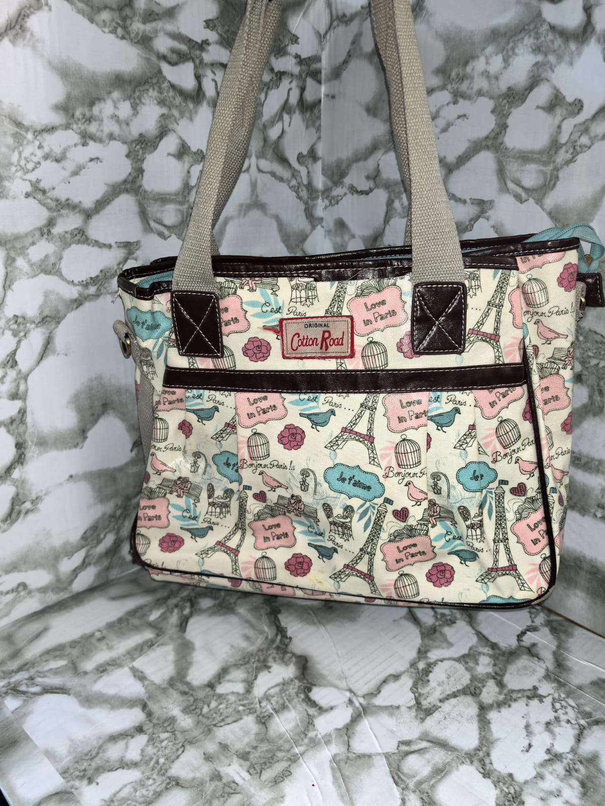 Large womens hand bag with diffrent prints on.